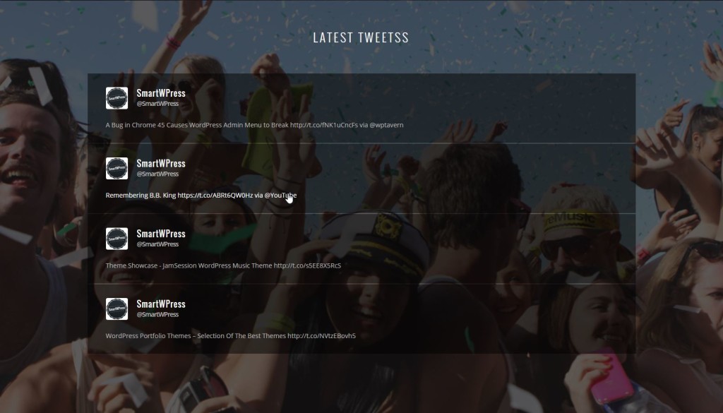 JamSession theme comes with a dedicated Visual Composer element that you can add to your website and get the latest tweets for your twitter account.